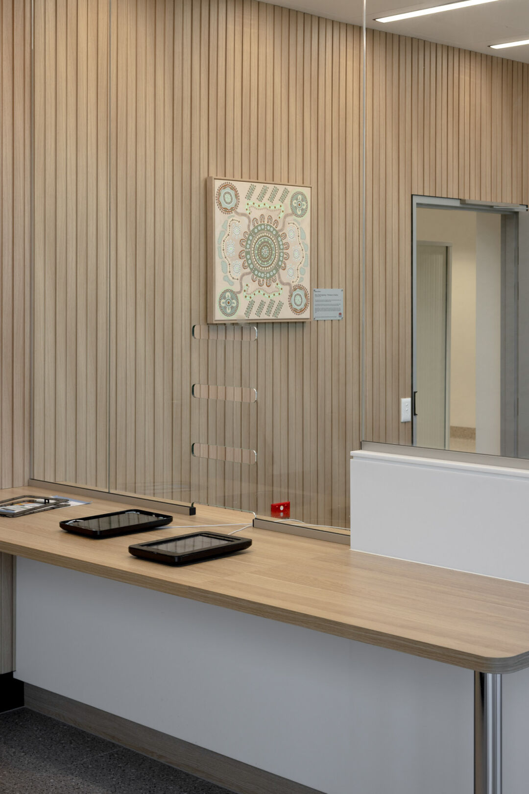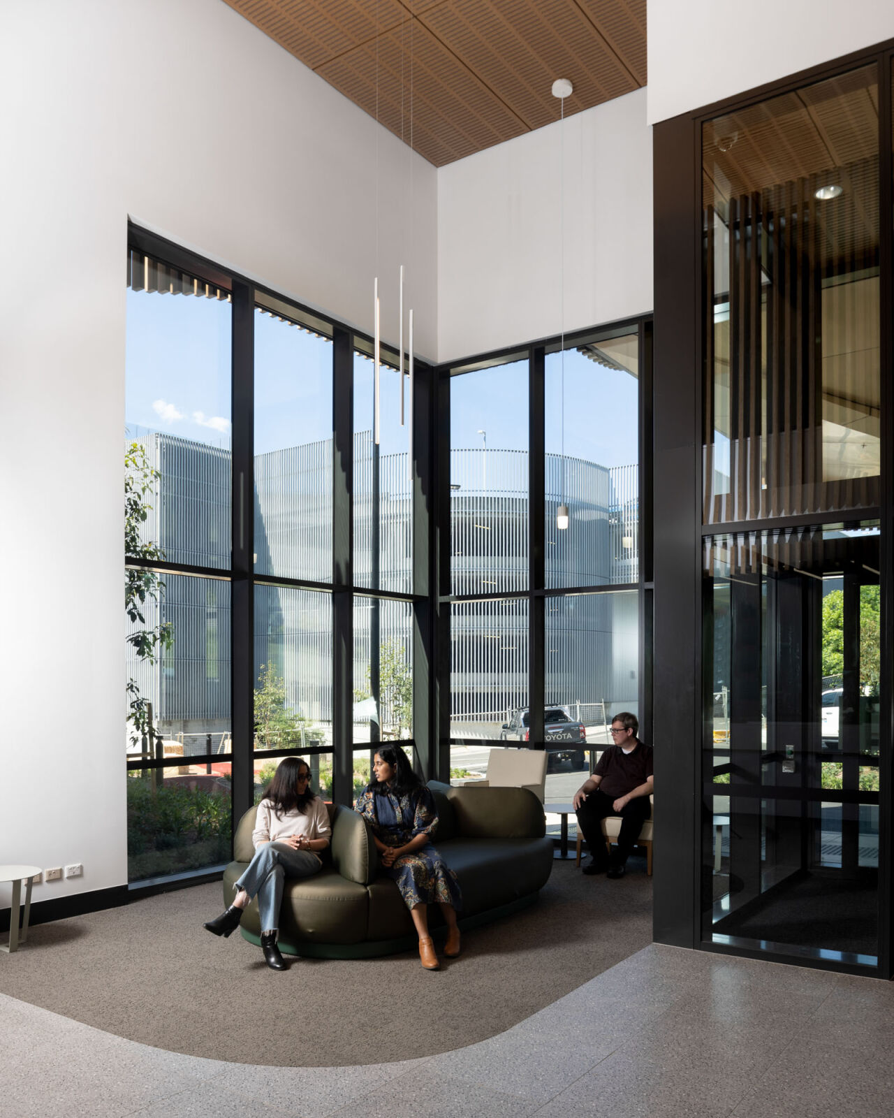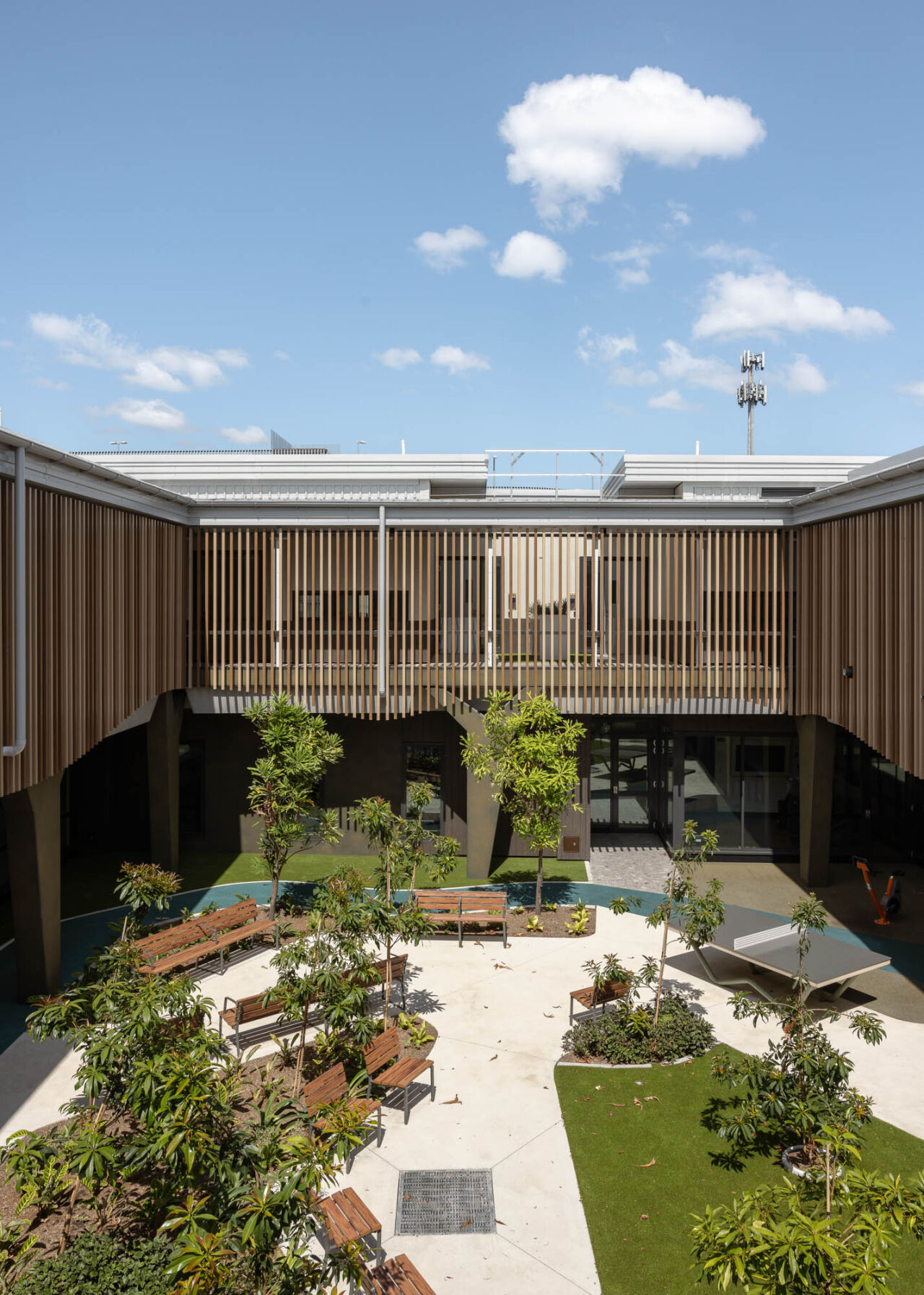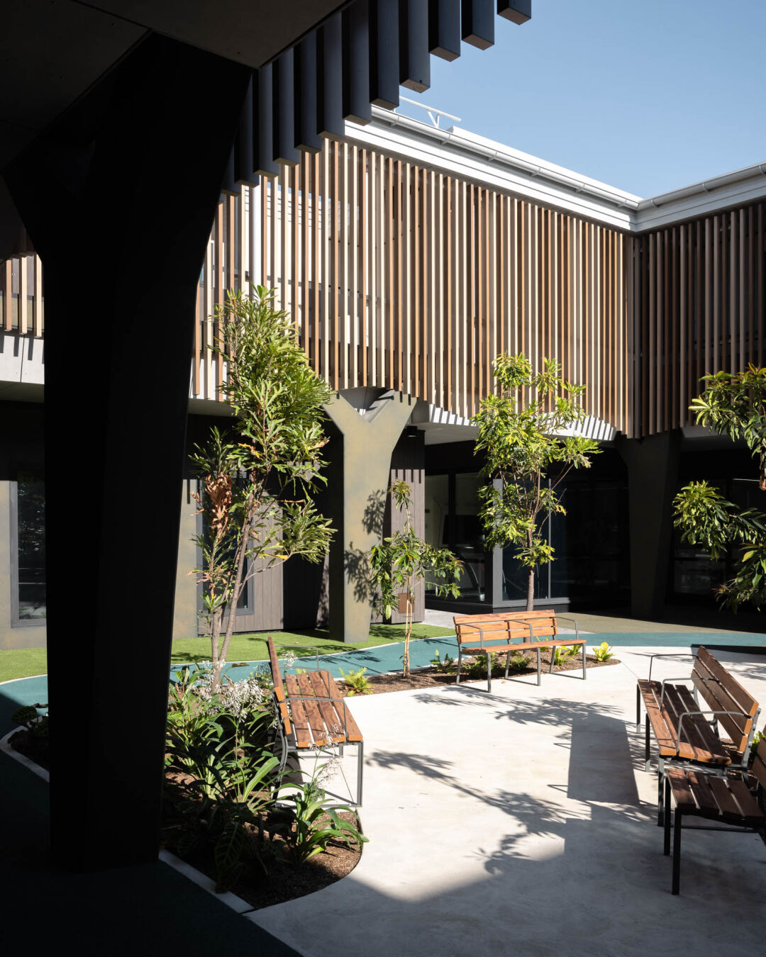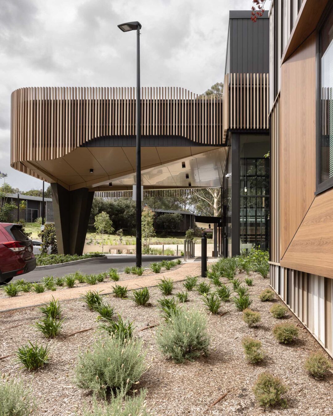 The centre’s façade, inspired by native red gum and lilli pilli trees, and its civic entry plaza with oversized angular window boxes, reflect a commitment to transparency, vibrancy, and community engagement.