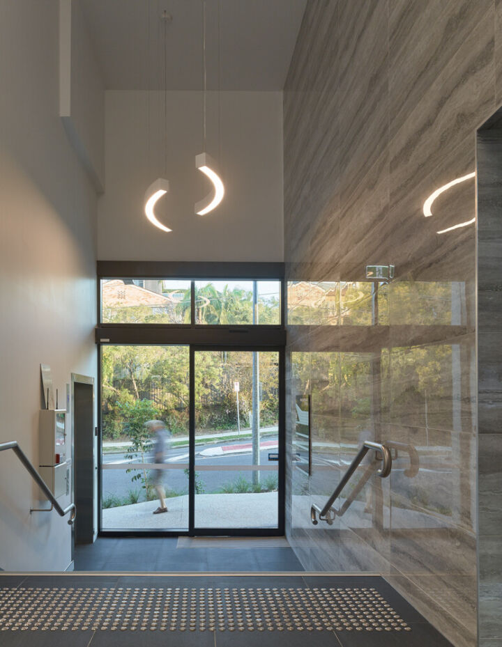 The centres façade is lined in precast panels which plays to the centre's location in the Auchenflower, depicting a Refidex style map of the surrounding streets set 30mm deep into the concrete with stainless steel pins for street names. The benefits of using precast panels were twofold, firstly, double height panels allowed the building to progress faster, whilst also provided an immediate safety barrier against the Queensland Rail corridor.