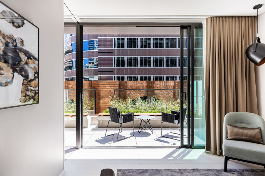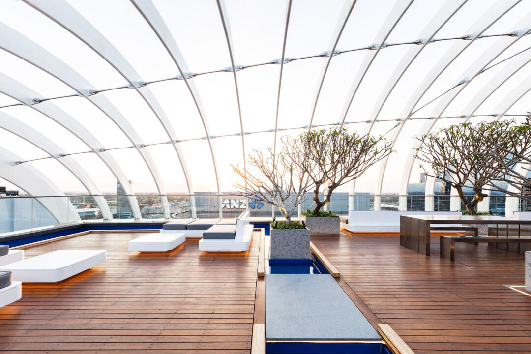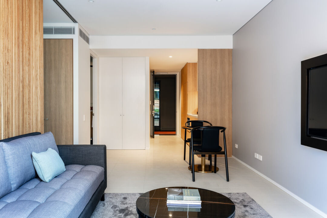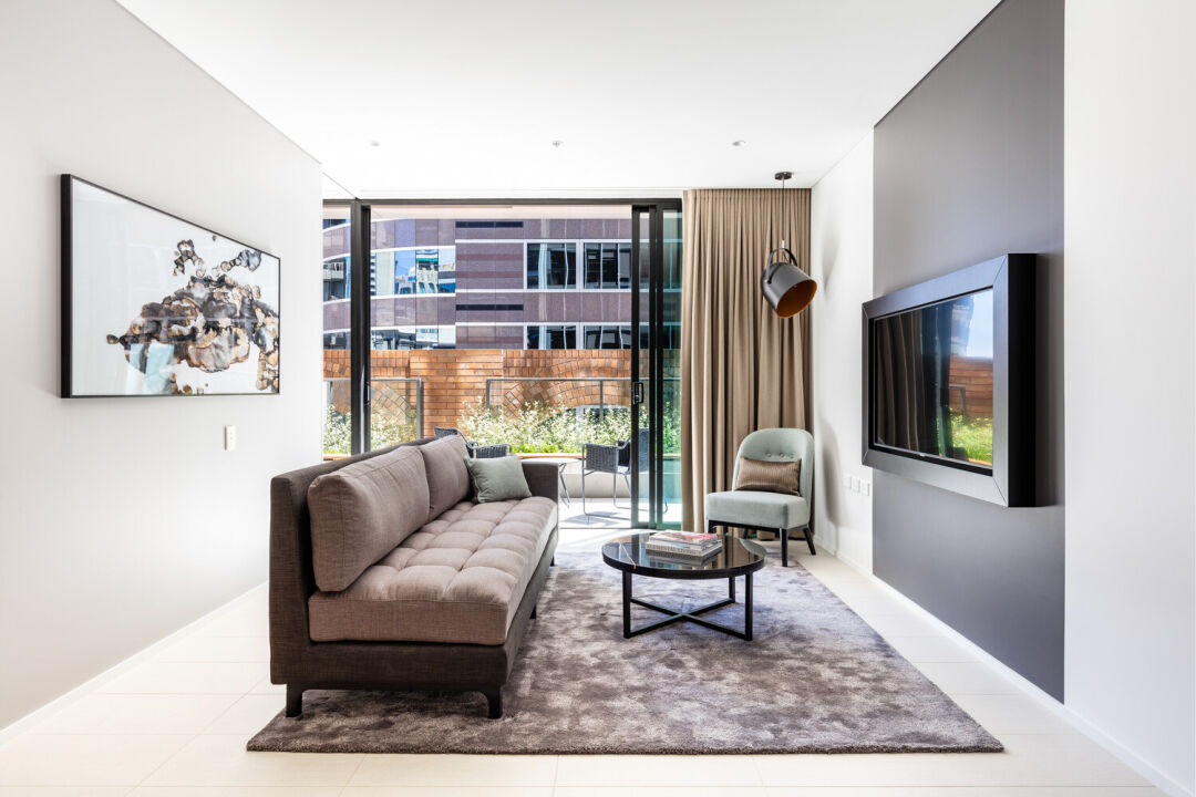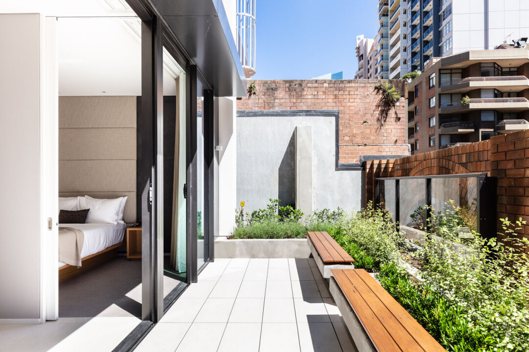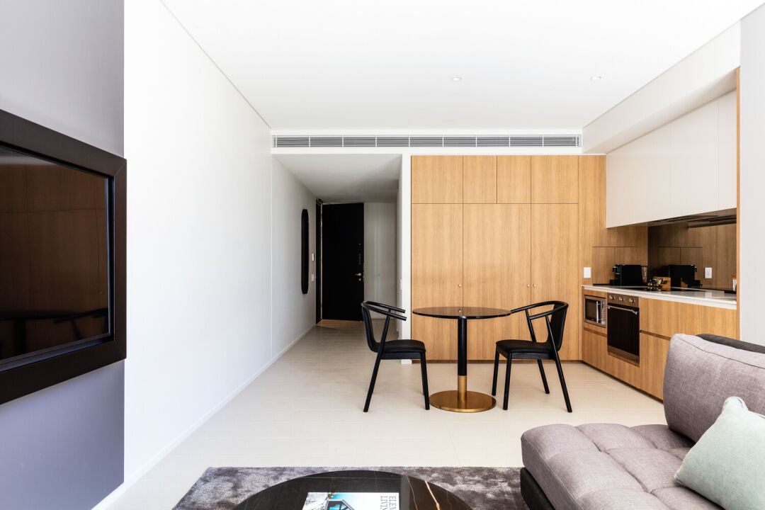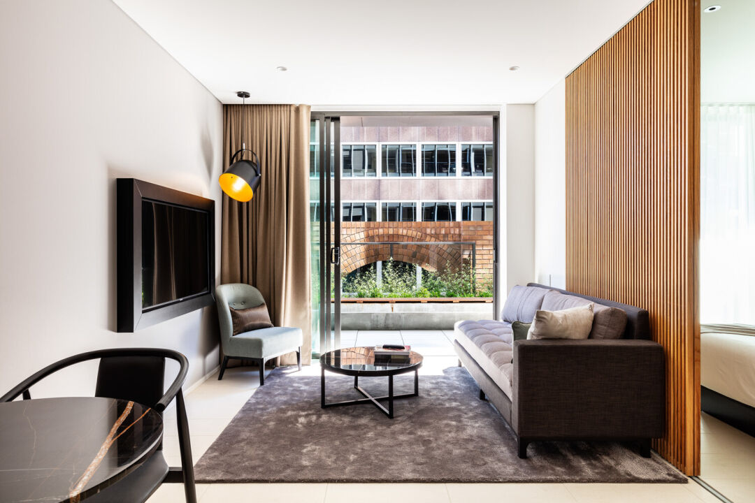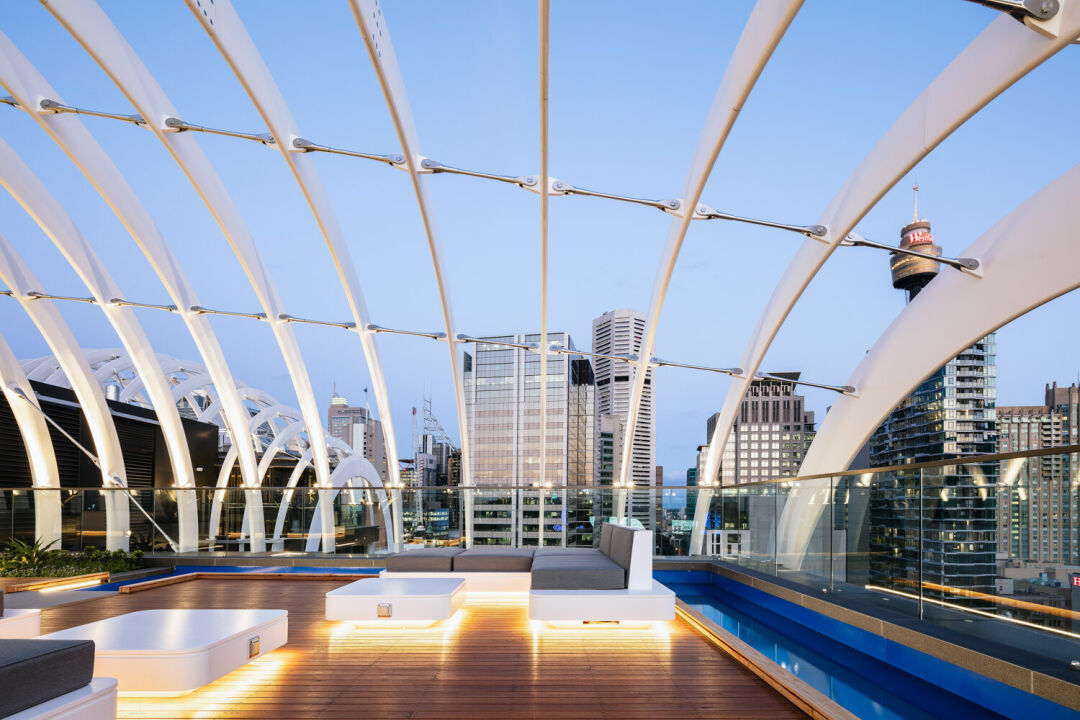 The indulgent apartments feature amenities such a spa, gym, and reflection pool and rooftop courtyard on the penthouse level. Skye Suites Sydney occupies 73 suites and offers larger than typical hotel rooms with 5 star amenities.