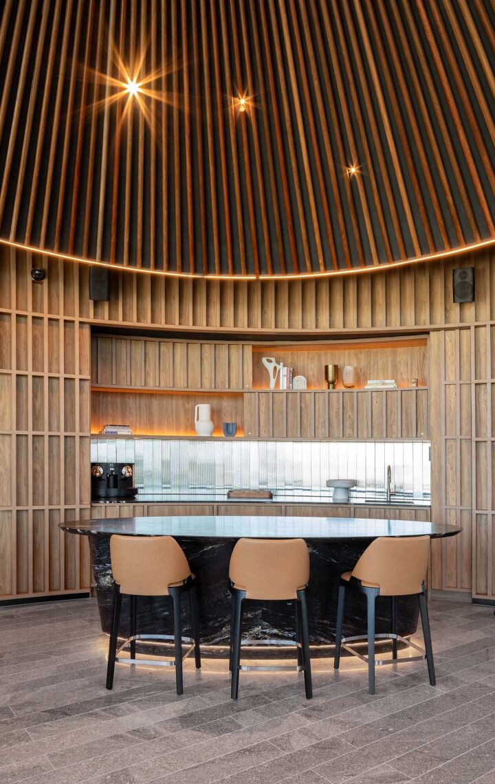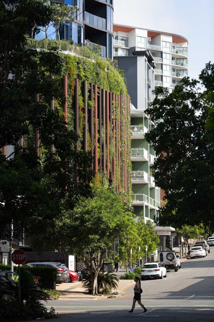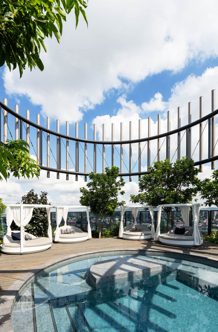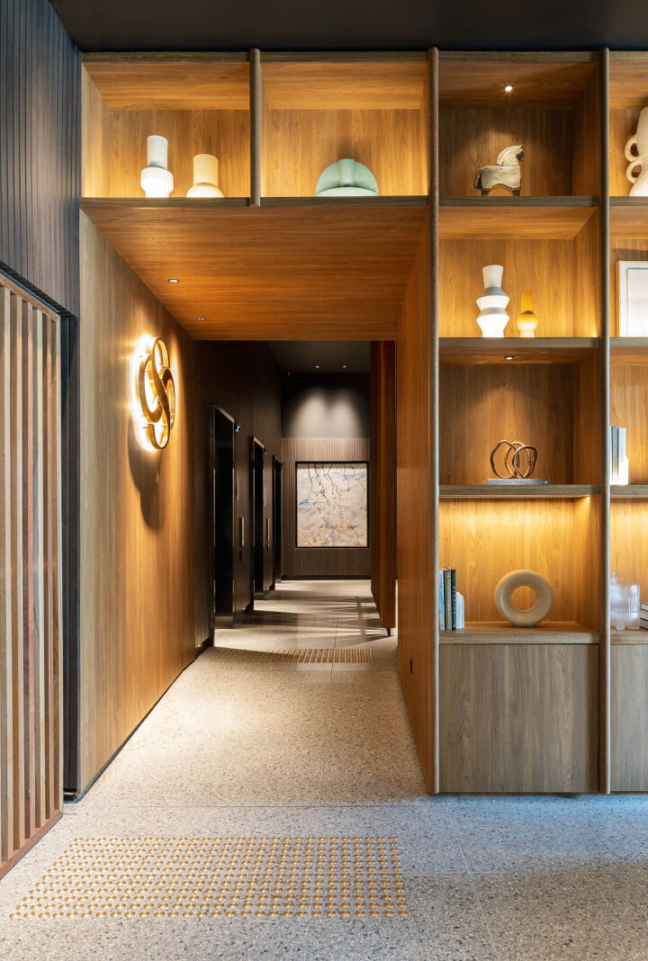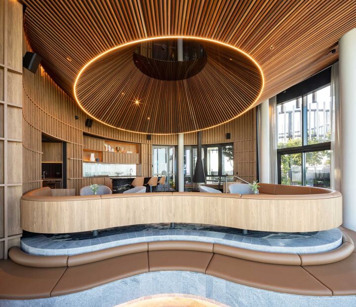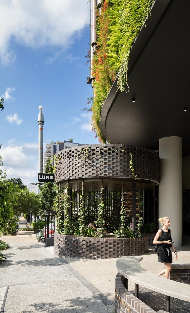 Wrapping around the lower levels of the curving façade is an extensive green wall, which on completion is expected to be Australia’s largest. Smaller green walls and water features are also incorporated into the main lobby and recreation levels to provide a cooling effect for residents.