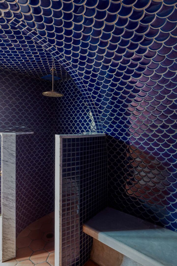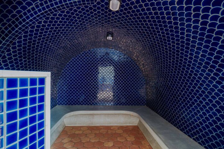 The design includes a distinctive vaulted/domed ceiling within the steam room. Although this presented something of an execution challenge, we were able to remain faithful to the design intent without losing the integrity of waterproofing system. This was achieved by using structural framing of the ceiling and walls in an arch that kept a continual radius and that would not impede on the seating arrangements. The walls and ceiling were lined with FC and waterproofed to allow a fish scale type tile to be fixed. A concrete seat was also formed to allow an ergonomic seat arrangement. We ensured the interface between multiple finishes such as stone, curved tile ceilings, fabric walls, VJ panelling, and plasterboard achieved a seamless finish.