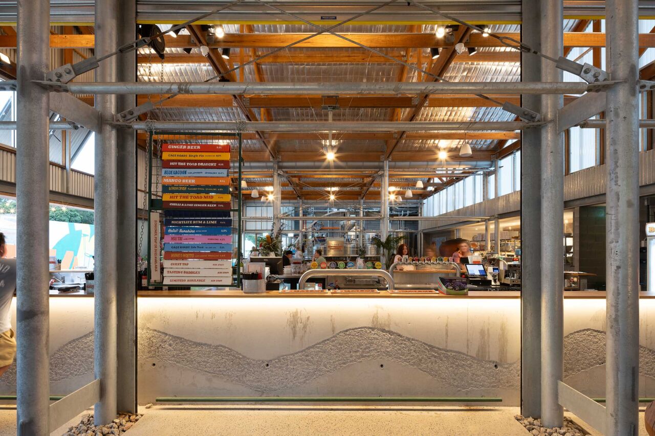 Corrugated iron roof sheets were salvaged from the existing buildings and repurposed as feature cladding on the brewery wall between the two buildings. The main bar highlights the initiative to use excess concrete from other pours in the project to build a practical structure.