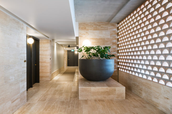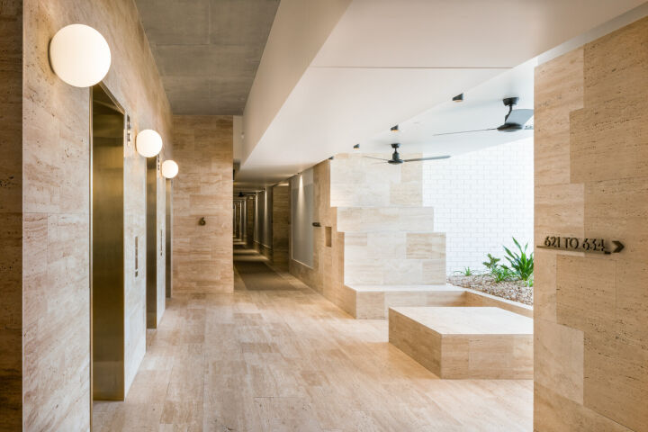 - Natural ventilation in the lobbies using ‘Claypave’ breezeblocks, travertine wall cladding and floors