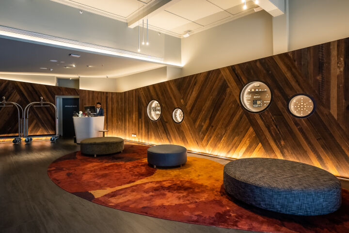 The hotel's design makes the most of the shopping centre's roof area by building on top of the complex and revitalising a heritage building on Liverpool Street as its main entry point.