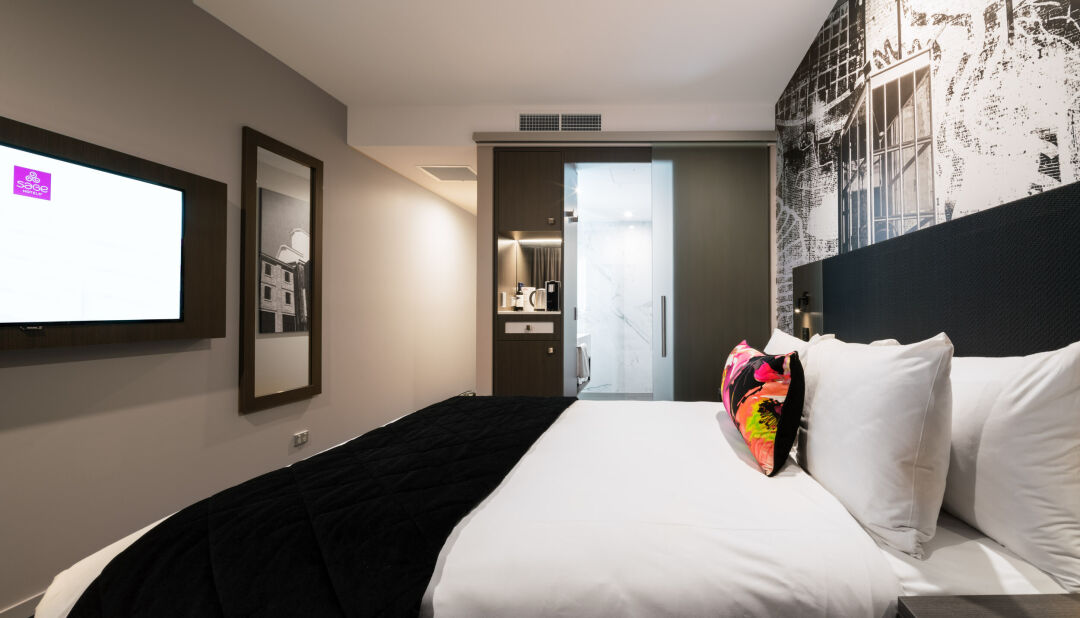 Sage Hotel is a new 93 room, 4½ star hotel, located in the heart of Brisbane’s iconic James Street. The building contains one basement car park level, a ground floor foyer with two retail/restaurant tenancies, and four levels of hotel rooms. The building is a trendy, modern hotel, which combines modern luxurious finishes with industrial elements. Some of the prevalent architectural features of the building include: “Corten” cladding to the James Street façade, a unique green wall in the atrium walkway, polished concrete floors and concrete reception desk to the foyer, and hotel rooms with high-end stone tops, LED mirrors, carpet tiles, local wall paper and modern appliances.