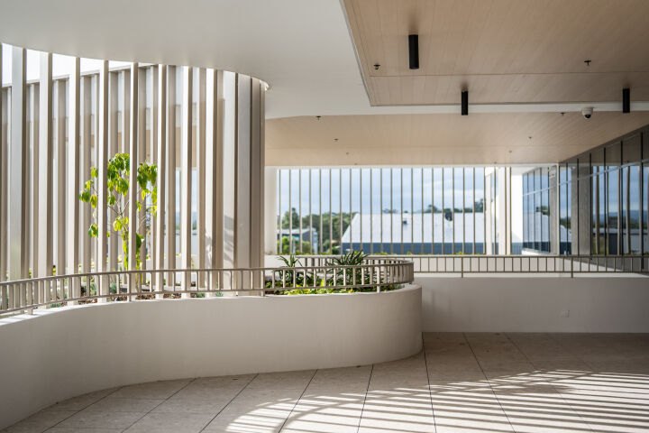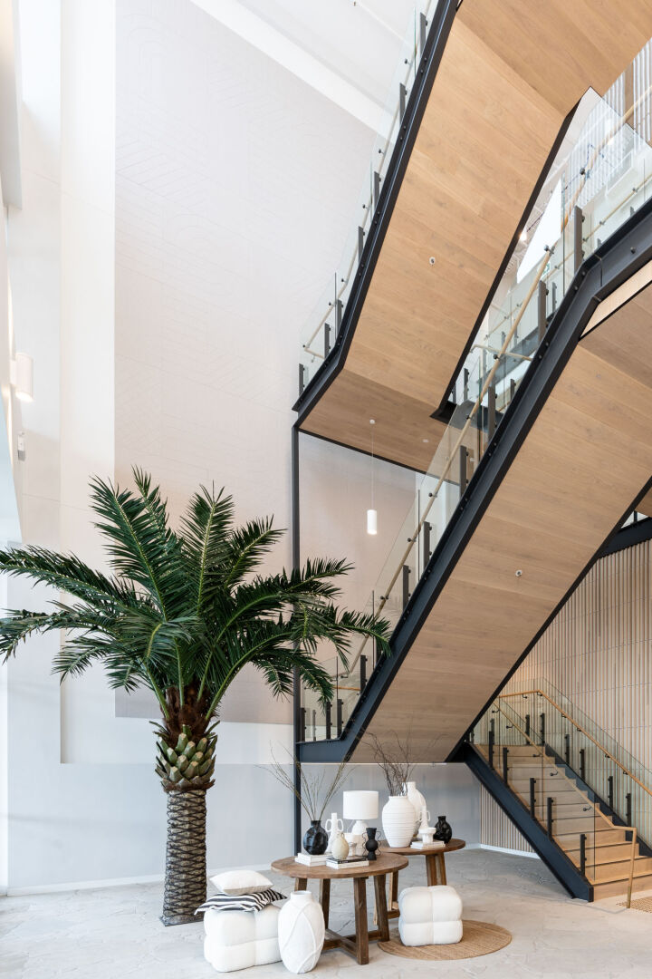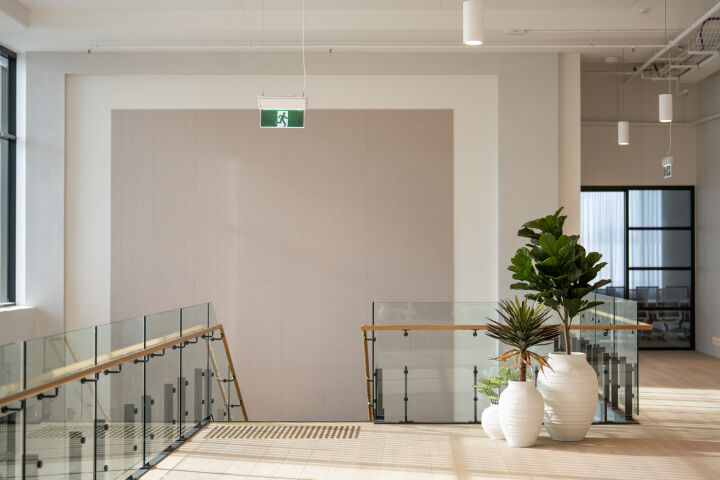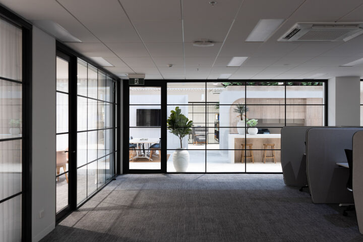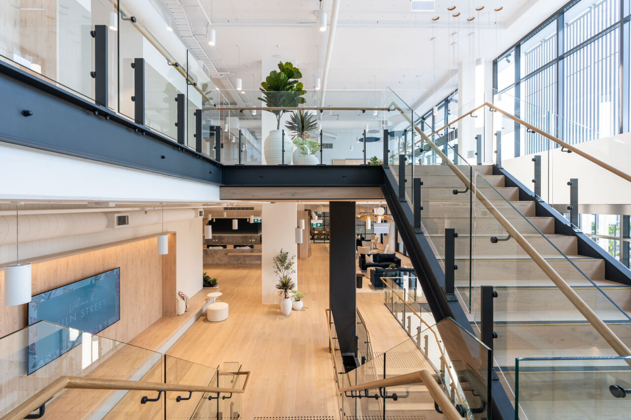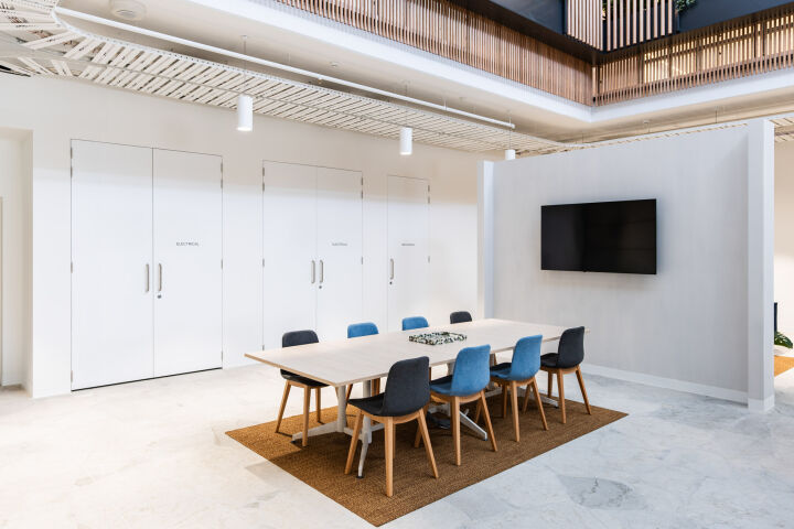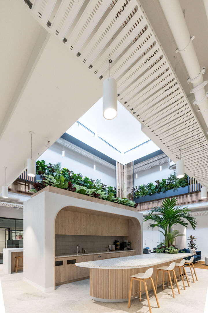 The office includes three atriums, with two extending from the first level to the roof and one from the ground to the roof. Their construction involved full height bird cage scaffolding, top down assembly of roofs and finishes, and bottom up installation of feature stairs, crafted by specialists for precision and quality, using a spider crane due to the complexity of the installation post roof construction.