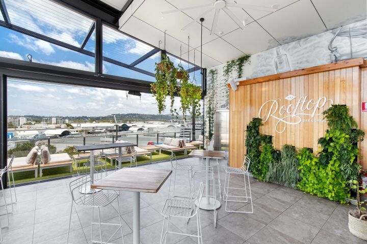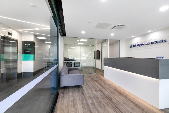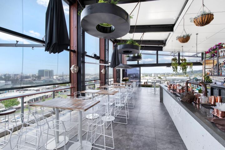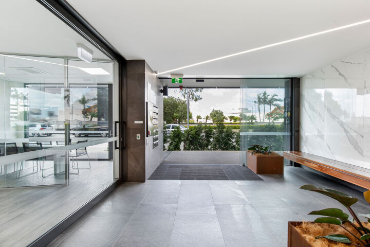 Eight Maroochydore Road is a new seven level building with an open-air rooftop bar. Office tenancies occupy six levels of the building, which is in addition to the existing smaller office building on the site. The new building is cantilevered over the old building to utilise the air space above. At ground level there are two drive-through restaurant tenancies below a suspended car park built above, providing parking for the office tower.