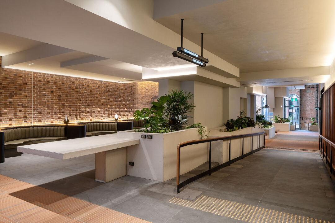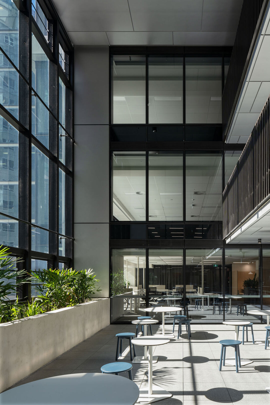 At the base of the building there is a new laneway connecting Charlotte Street through to Mary Street, which includes a mix of retail and hospitality spaces that activate the precinct at ground. On the Charlotte Street side, a heritage façade, built circa 1890, was carefully restored and enhanced. Above is a 3-level mixed use podium separated by a central naturally ventilated glass atrium.