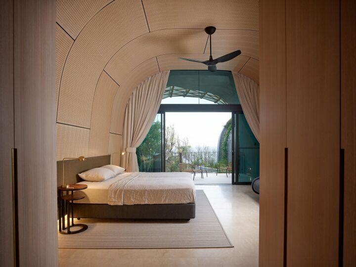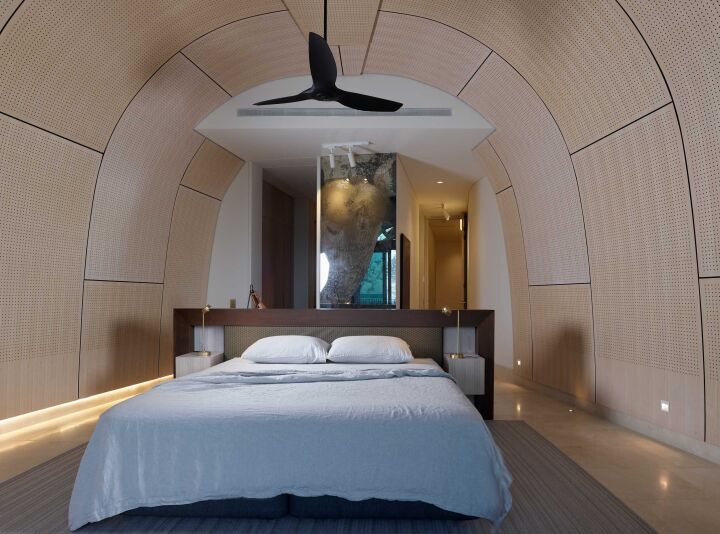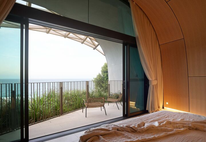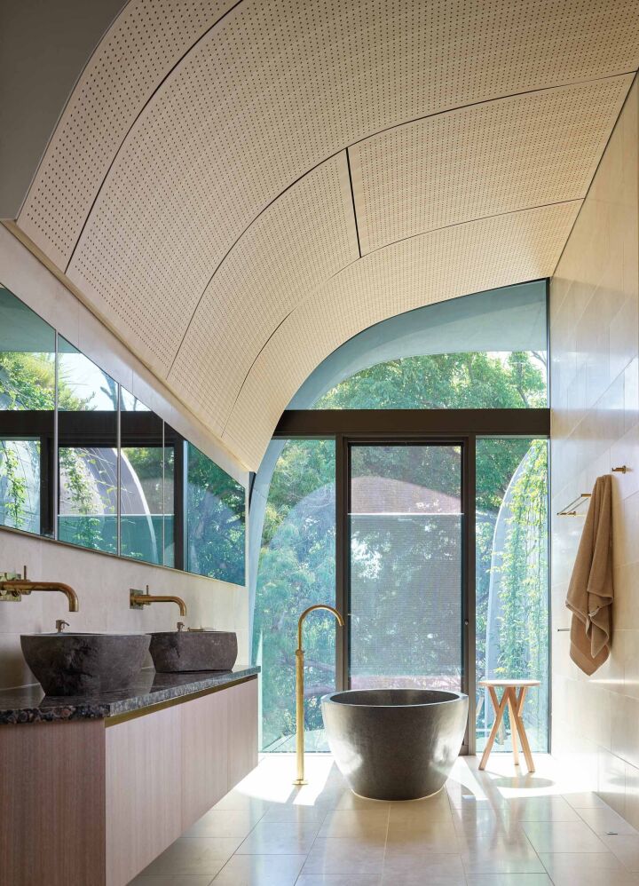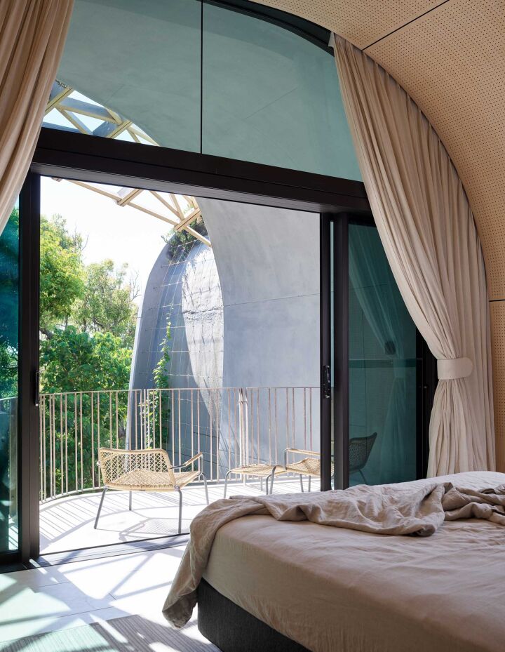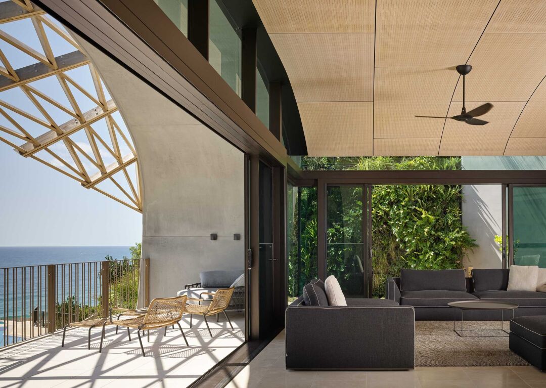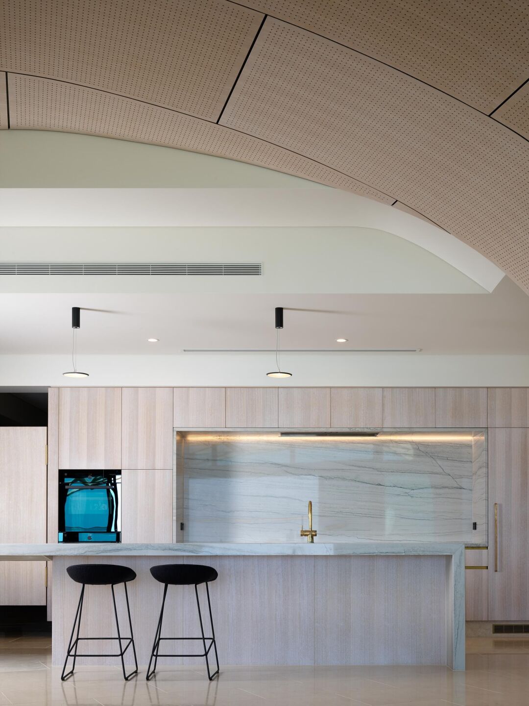 Externally, the curved roofing is covered in native landscaping, fusing the structure with the surrounding bushland and dune system. Internally, the uniquely vaulted ceilings are lined with acoustic plywood feature panels.