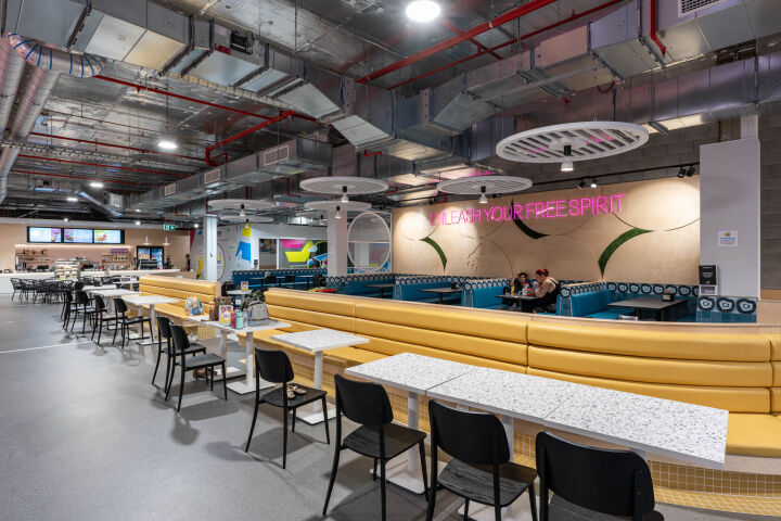 To meet structural load requirements, lighter materials were used throughout, including steel, concrete, blocks, and exposed brickwork. The entry lobby was redesigned to create a striking two-level auditorium, requiring structural redesign, new steel supports, and fire rating adjustments. Fire engineering solutions enabled open-air lobby integration with retail entrances, using discreet smoke baffling and feature arch grilles.