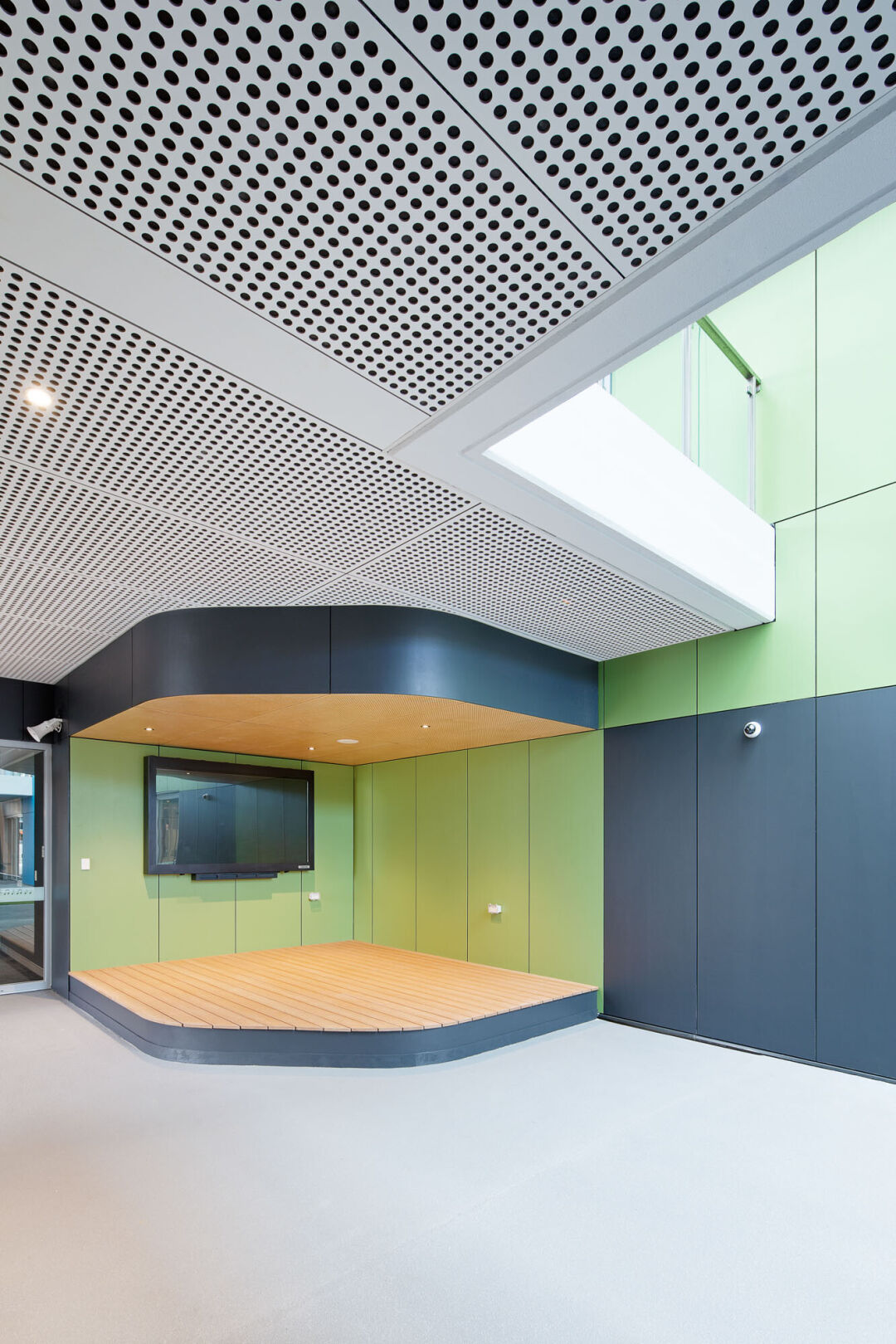 Outside is a range of unique outdoor learning spaces, a basketball court, a BBQ area, and landscaping. On level 1, the basketball court has been built on a suspended slab above classroom areas, to maximise space on the high school's campus area. Hutchies undertook extensive detailed planning to ensure the structure was watertight and acoustic levels were of the highest standard to safeguard the spaces below.