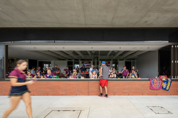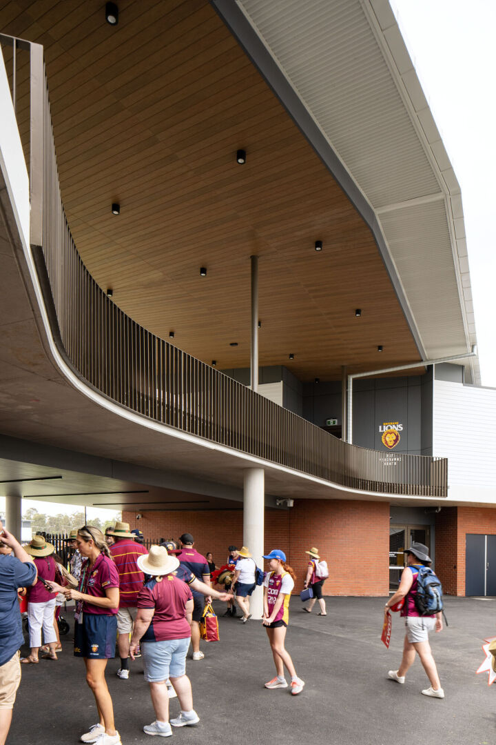 The design has taken to heart the need to weave together the long and proud history of the Fitzroy Football Club with the success and distinctly sub-tropical Queensland home of the Brisbane Lions. Brunswick Street Oval, the Lions’ spiritual home in Fitzroy provided the early design inspiration for the Grandstand and architectural elements including the red brick and exposed concrete that has been used across the site; while the traditional timber ‘Queenslander’ family home with its high ceilings and wide verandas has also influenced the design, inside and out.